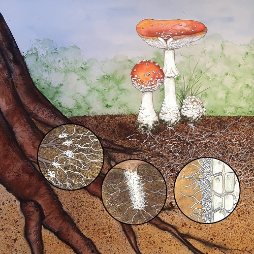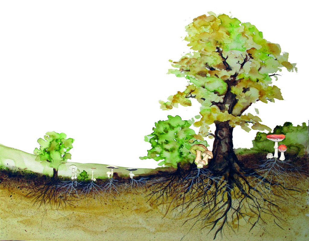Dabei verbindet sich das unterirdische Fadengeflecht mit den Feinwurzeln der Bäume. Ungefähr 90 % aller Pflanzen sind im wahrsten Sinne des Wortes vernetzt und profitieren von dieser Symbiose, der sogenannten Mykorrhiza (altgr. mýkēs, Pilz und rhiza, Wurzel).