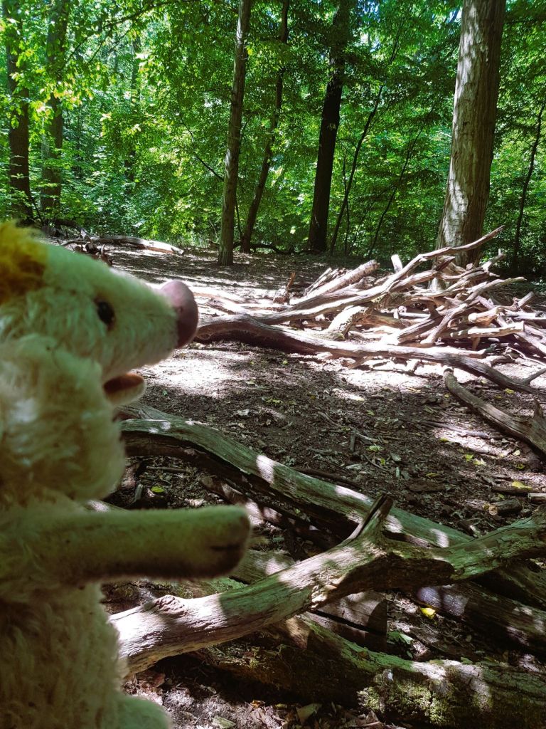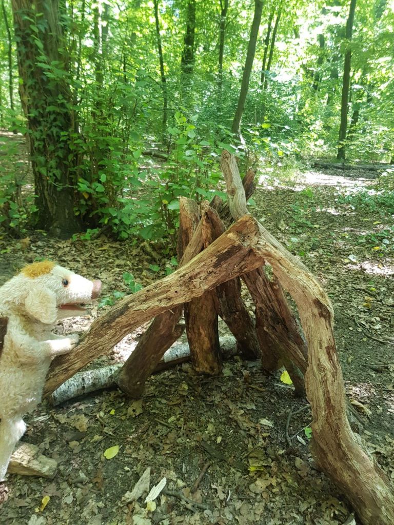 Als ich weiterging kam ich zu einem Platz mit ganz vielem alten Holz und tollen Stöcken. Der Platz erinnerte mich sofort an die Wald-Baustelle. Da kam mir eine Idee: Ich bau mir einen eigenen Waldspielplatz mit Hütte, Wippe und Balancierstrecke. Das wird toll!!!