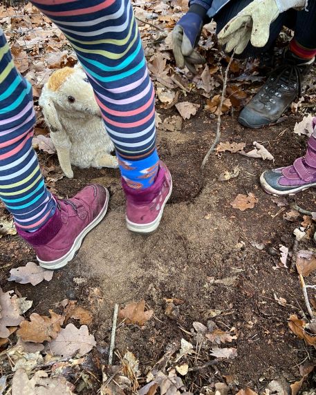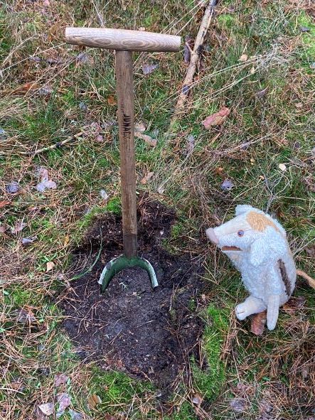 Dann geht es los. Wir benutzen zum Pflanzen einen Pflanzspaten. Der ist sehr praktisch, denn man kann damit ein Loch aus dem Boden ausstechen. Und wenn alles gut geht, dient der Pfropfen im Spaten wieder zum Schließen des Pflanzlochs. Vor dem 1. Spatenstich schiebe ich das Laub oder was sonst den Boden bedeckt etwas zur Seite. Damit keine Blätter oder ähnliches in das Loch fallen und dadurch später Hohlräume entstehen.